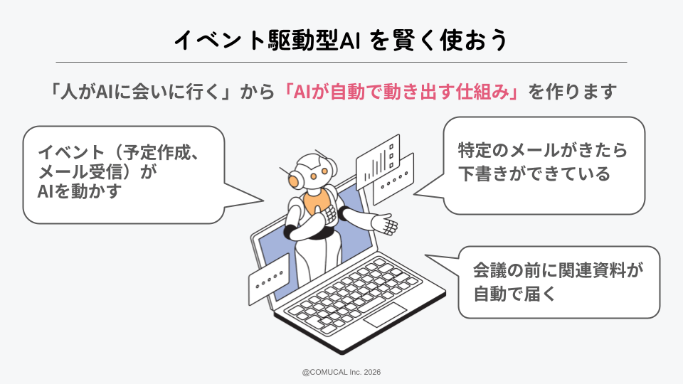 これは、あなたがわざわざAIに話しかけに行かなくても、日常の「イベント」をきっかけ(トリガー)にして、AIが裏側で自動的に動き出す仕組みのことです。