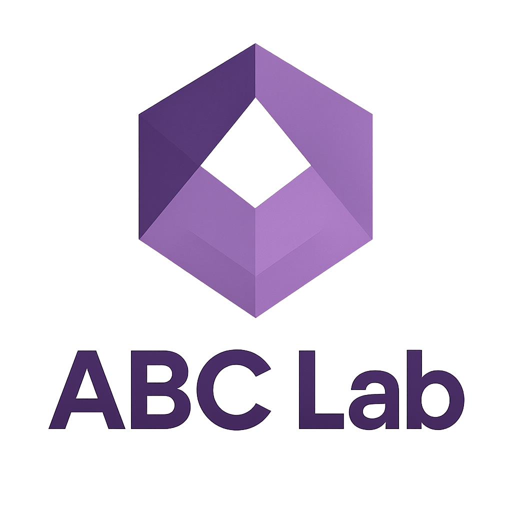 「紫色を基調とした、幾何学的な形のロゴで、ABC Labというテキストを含む」