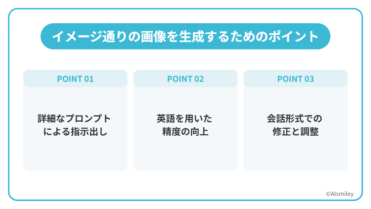 画像生成の精度を高めるには、プロンプトをできるだけ詳しく書くことが重要です。
