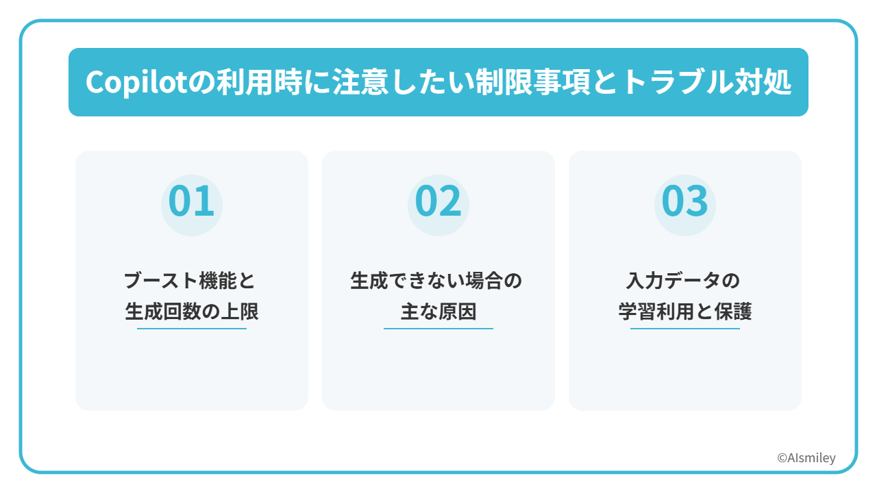 ここでは、快適かつ安全にCopilotを利用するために知っておくべき3つのポイントについて、順番に解説していきます。