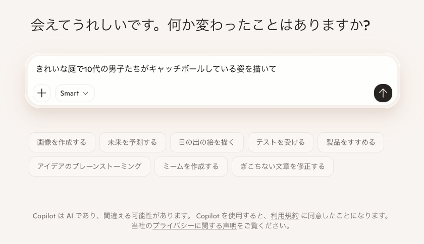サインインが完了するとチャット欄が表示されるので、そこにプロンプト(AIへの指示文)を入力します。