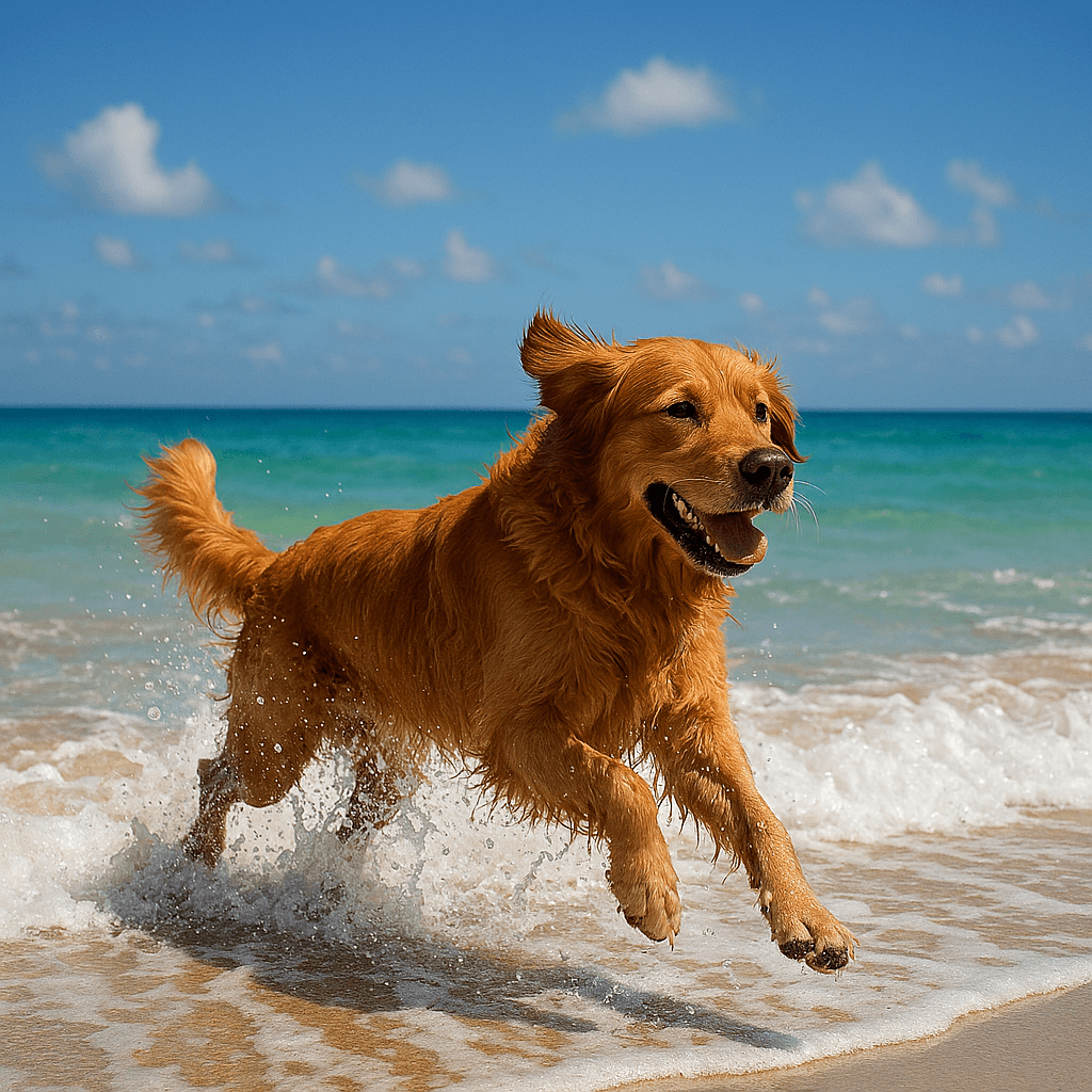 たとえば「青空が広がる海辺で、茶色いゴールデンレトリバーが白い波しぶきを上げながら走っている様子」と書けば、空の色や波の状態まで指定できます。