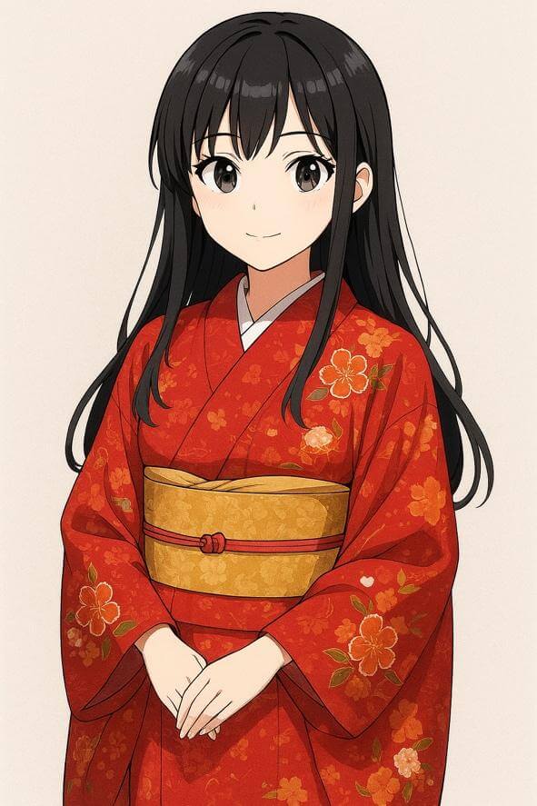 「長着物を着た黒髪のアニメ風の女性の画像を生成してください」