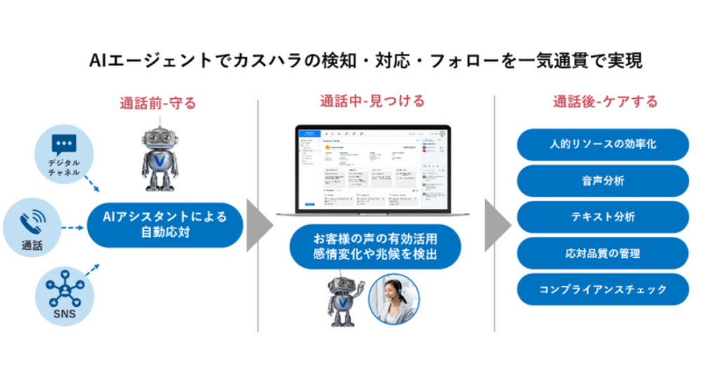 「Verint AI Bots」は、顧客接点で発生する音声やテキストデータをAIが分析し、カスタマーハラスメントの早期検知と対応を支援します。また、顧客の声の活用や自動応答による業務効率化、人員配置の最適化などコンタクトセンター運営の省力化を実現します。