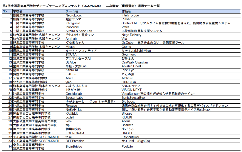 DCON実行委員会は、高専生向け「ものづくり」とディープラーニングを活用した事業創出コンテスト「第7回 全国高等専門学校ディープラーニングコンテスト2026(DCON2026)」において、二次審査の書類選考を通過し、面談選考へ進む34チームを決定しました。
