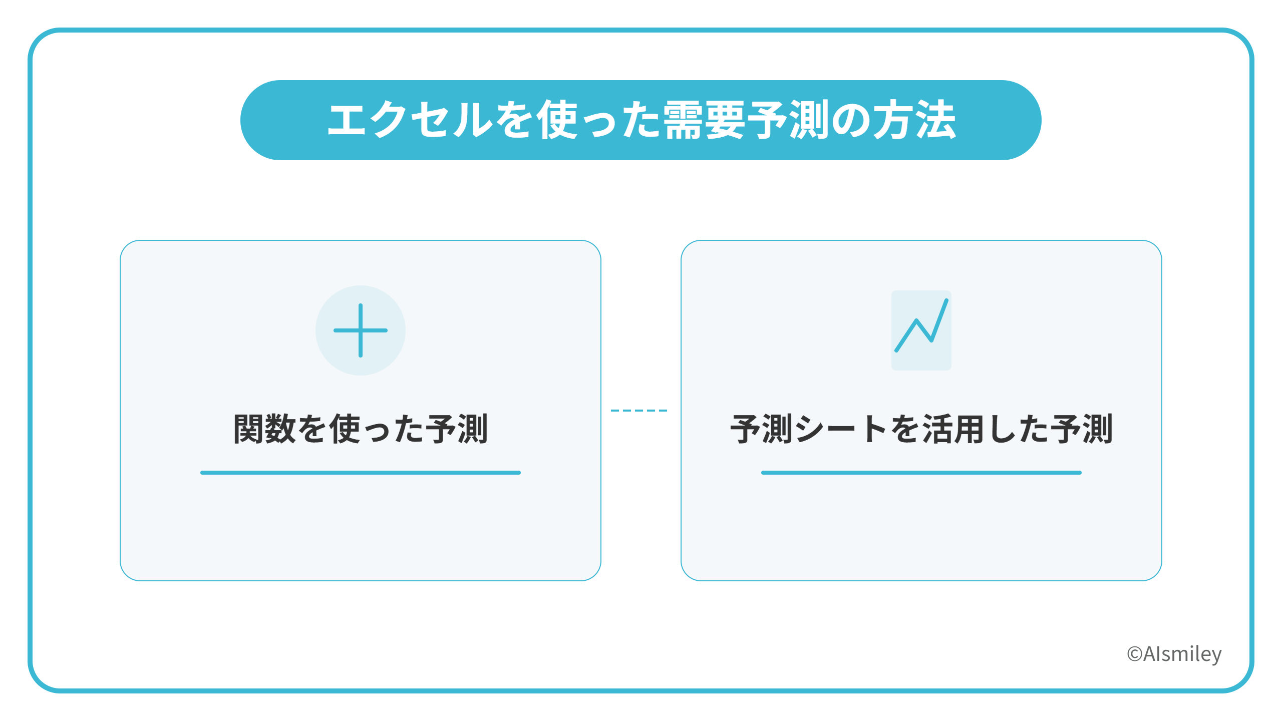 また、エクセルを使った需要予測の方法には、「関数を使った予測」と「予測シートを活用した予測」の2種類があります。それぞれの方法について、詳しく見ていきましょう。