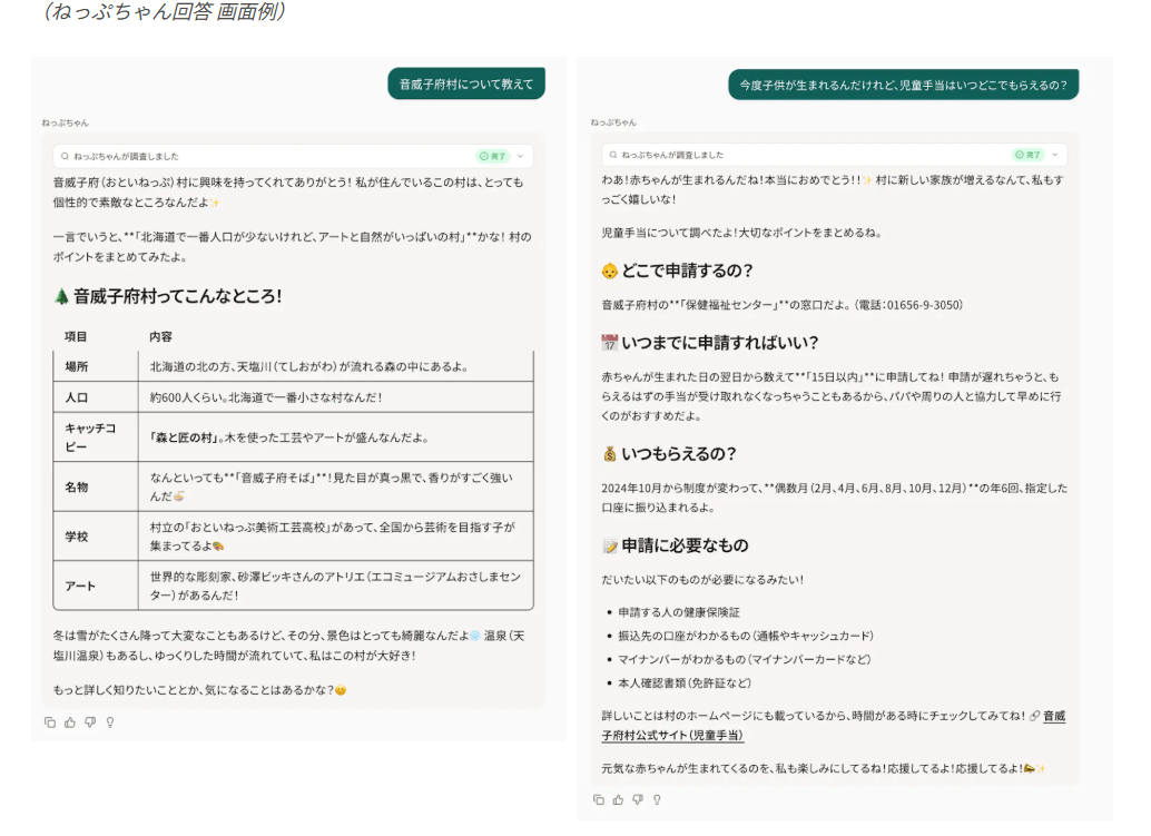 本プロジェクトの「ねっぷちゃん」は、村の公的資料や地域文化をもとに設計され、歴史や商店情報、冬季の生活に関する内容など、地域に根ざした情報に対応します。実証実験は2月19日(木)より開始済みです。