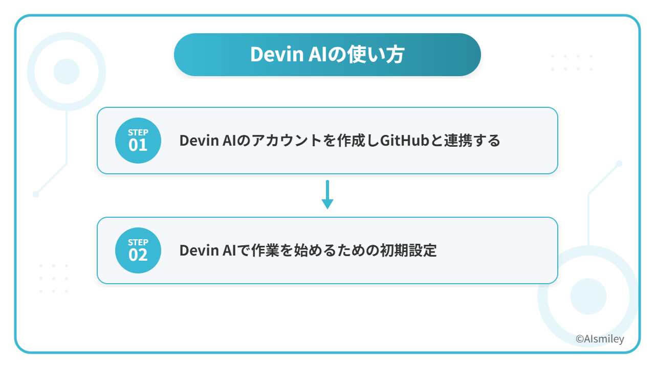 Devin AIの使い方を、アカウントの作成方法と初期設定の2つに分けてご紹介します。