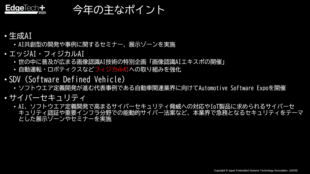 今年の主なポイントとして、昨年のAI活用から一歩進み、AIが実際の開発現場やものづくりにまで浸透し始めた点が最大の特徴です。これを象徴するように今回は、生成AIやエッジAI・フィジカルAI、SDV、そしてAI導入が進むにつれて問題意識の高まるサイバーセキュリティに重点を置いたカンファレンスや展示が数多く行われます。