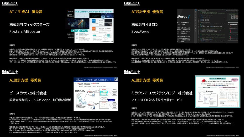 また、AI / 生成AI 優秀賞は、株式会社フィックスターズが、AI設計支援 優秀賞を株式会社イミロンとビースラッシュ株式会社、ミクラシア エッジテクノロジー株式会社が受賞しました。