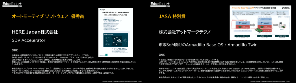 さらに、オートモーティブ ソフトウェア 優秀賞ではHERE Japan株式会社が受賞し、JASA 特別賞を株式会社アットマークテクノが受賞しました。