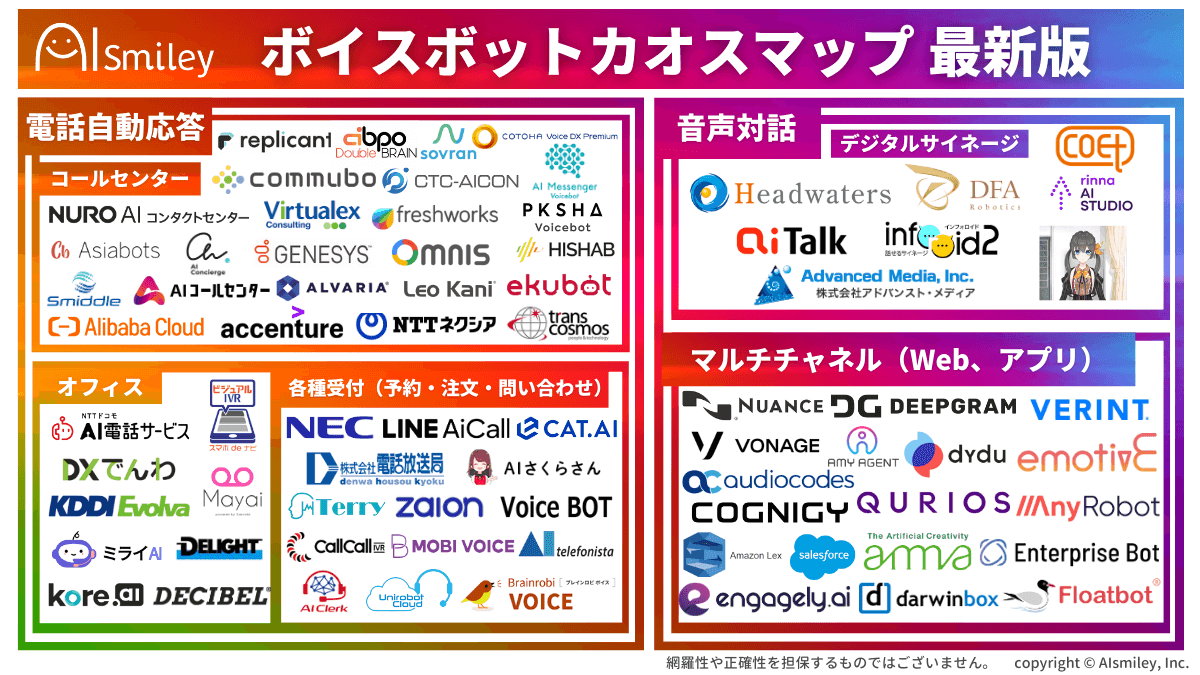 ちなみにAIsmileyでは、コールセンター向けAIソリューションを比較検討できるカオスマップを無料でお配りしています。さまざまなソリューションの特徴を比較することができますので、ぜひお気軽にご活用ください。