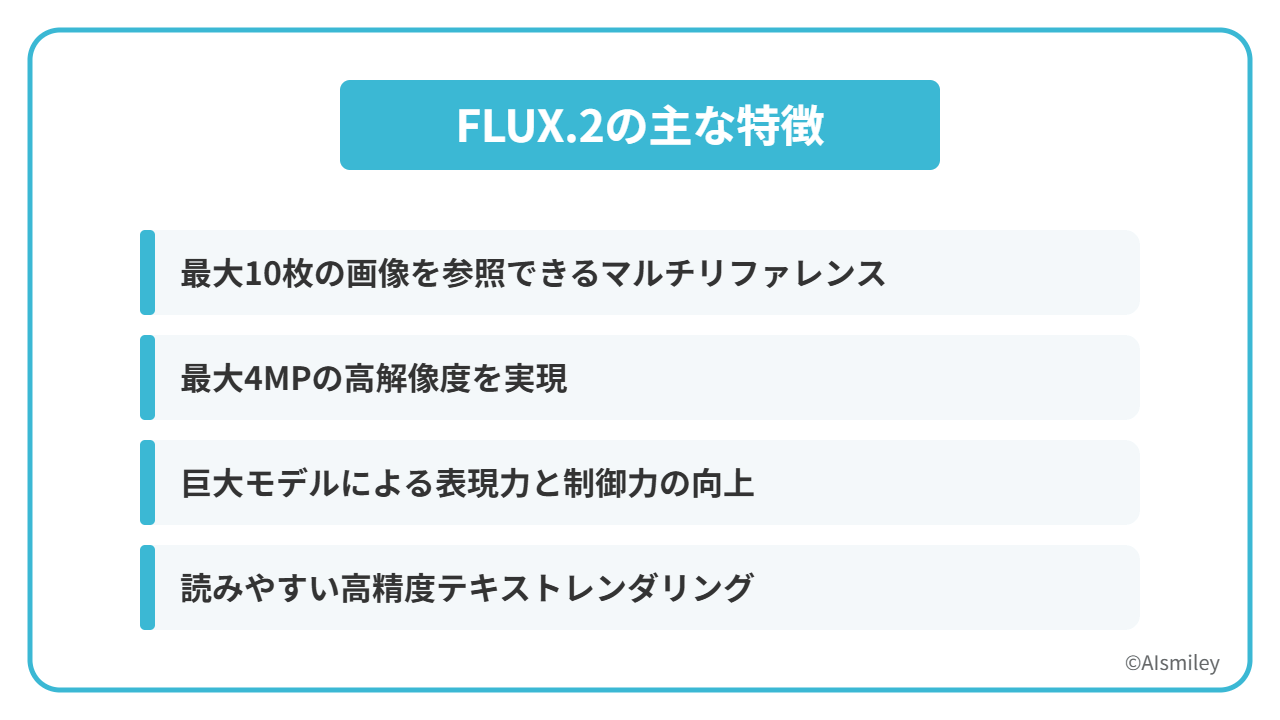 FLUX.2は、業界トップクラスの画像生成性能を誇り、多くの革新的機能を備えています。ここでは、FLUX.1からの進化を含め、代表的なFLUX.2の特徴を紹介します。