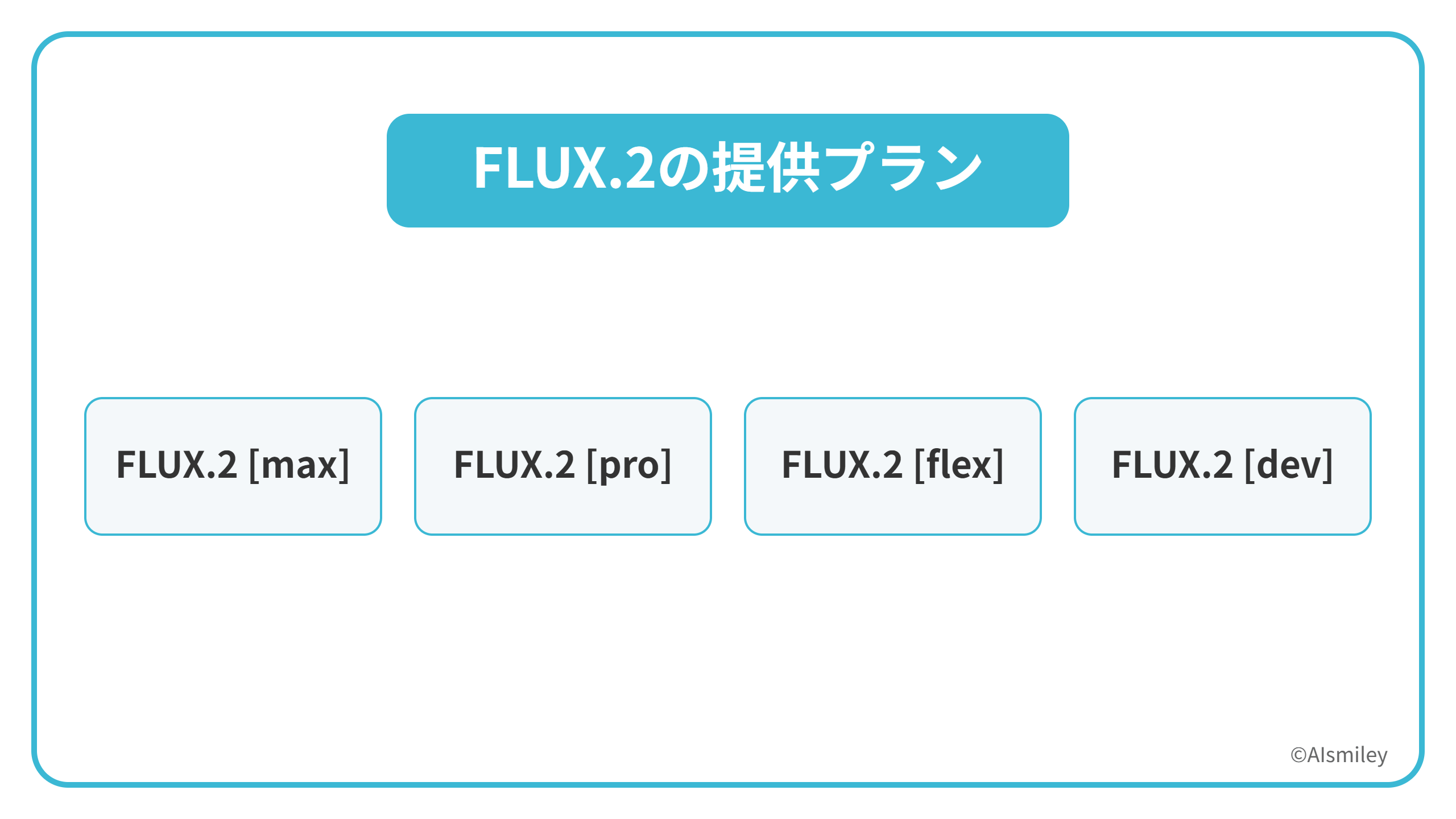 FLUX.2には、目的や用途に応じて選べる4種類のモデルバリエーションがあります。ここでは、それぞれの性能やライセンスの違いを整理します。