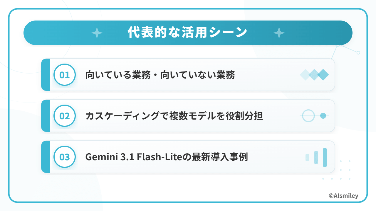 ここからは、Gemini 3.1 Flash-Liteの具体的な活用について見ていきます。性能が向上した最新モデルとはいえ、すべての業務に万能というわけではありません。