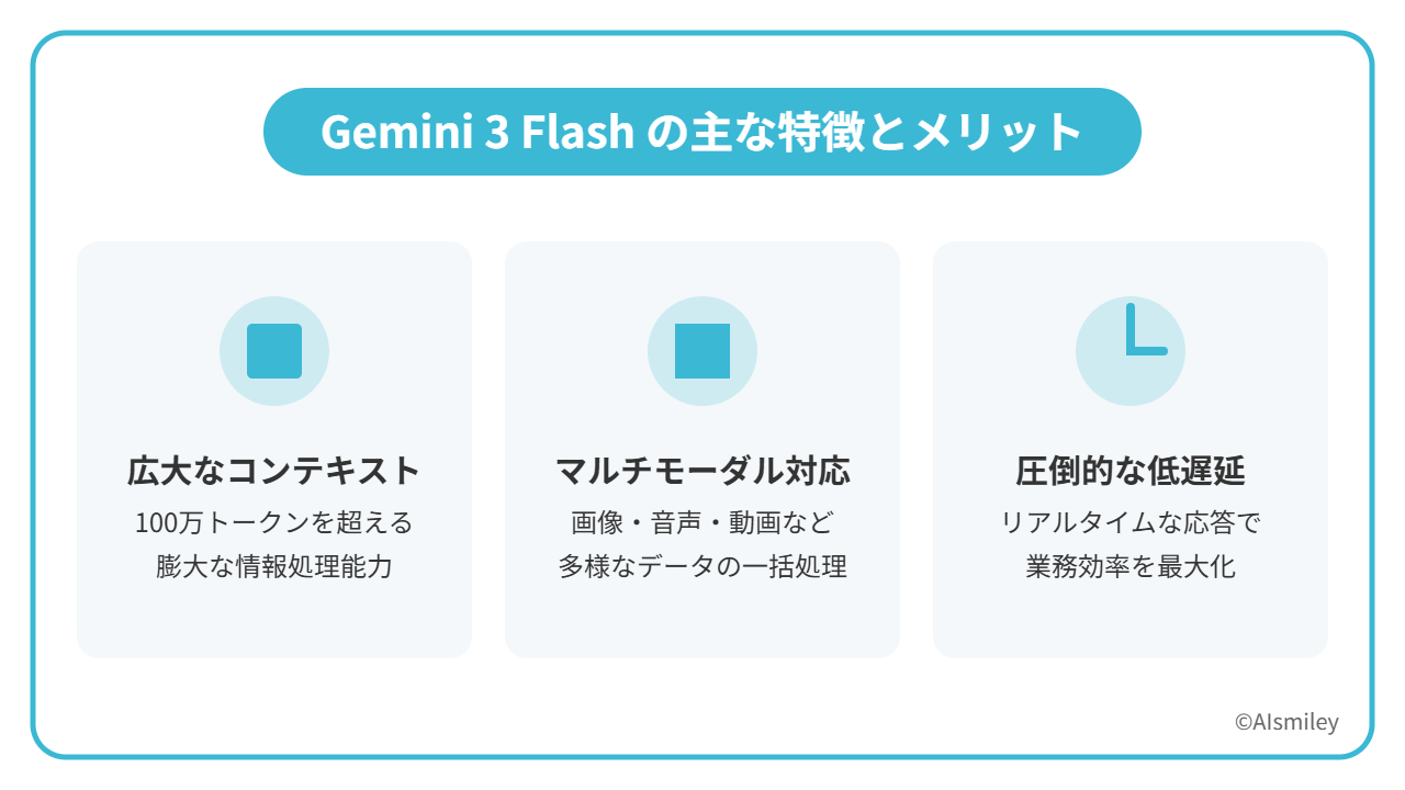 Gemini 3 Flashが選ばれる理由は、単に「速い」だけではありません。ビジネスの現場で実用的に使える「3つの強み」があります。