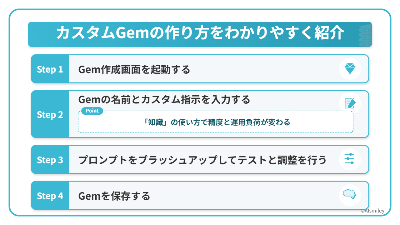 ※カスタムGemの指示は、思いつきの一文よりも「役割」「入力」「条件」「出力形式」を分けて書くと挙動が安定します。