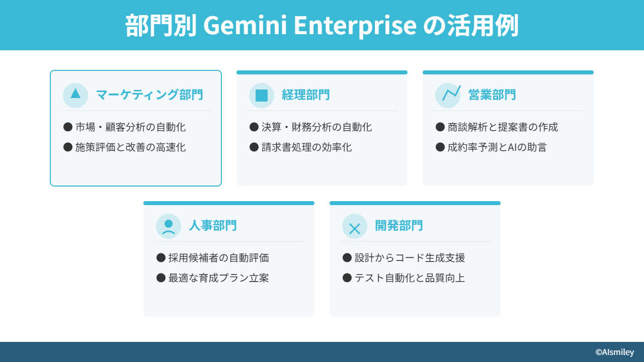 Gemini Enterprise では、各部門の業務データやワークフローに合わせて柔軟にAIを導入できます。ここでは、主要5部門における活用事例を紹介します。