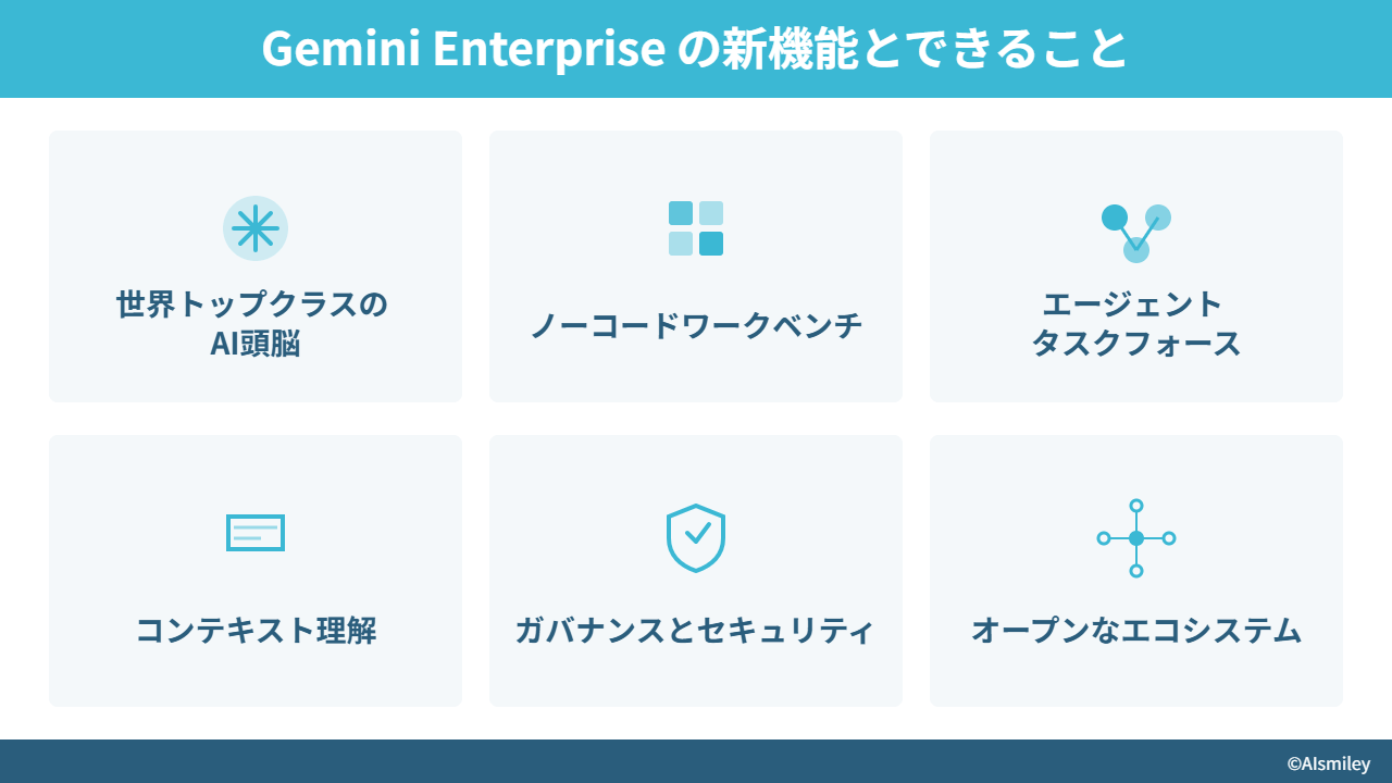 Gemini Enterprise は、単なるAIモデルを超えた包括的プラットフォームとして、さまざまな新機能を搭載しています。ここでは、Gemini Enterprise の特徴とできることについて詳しく解説します。