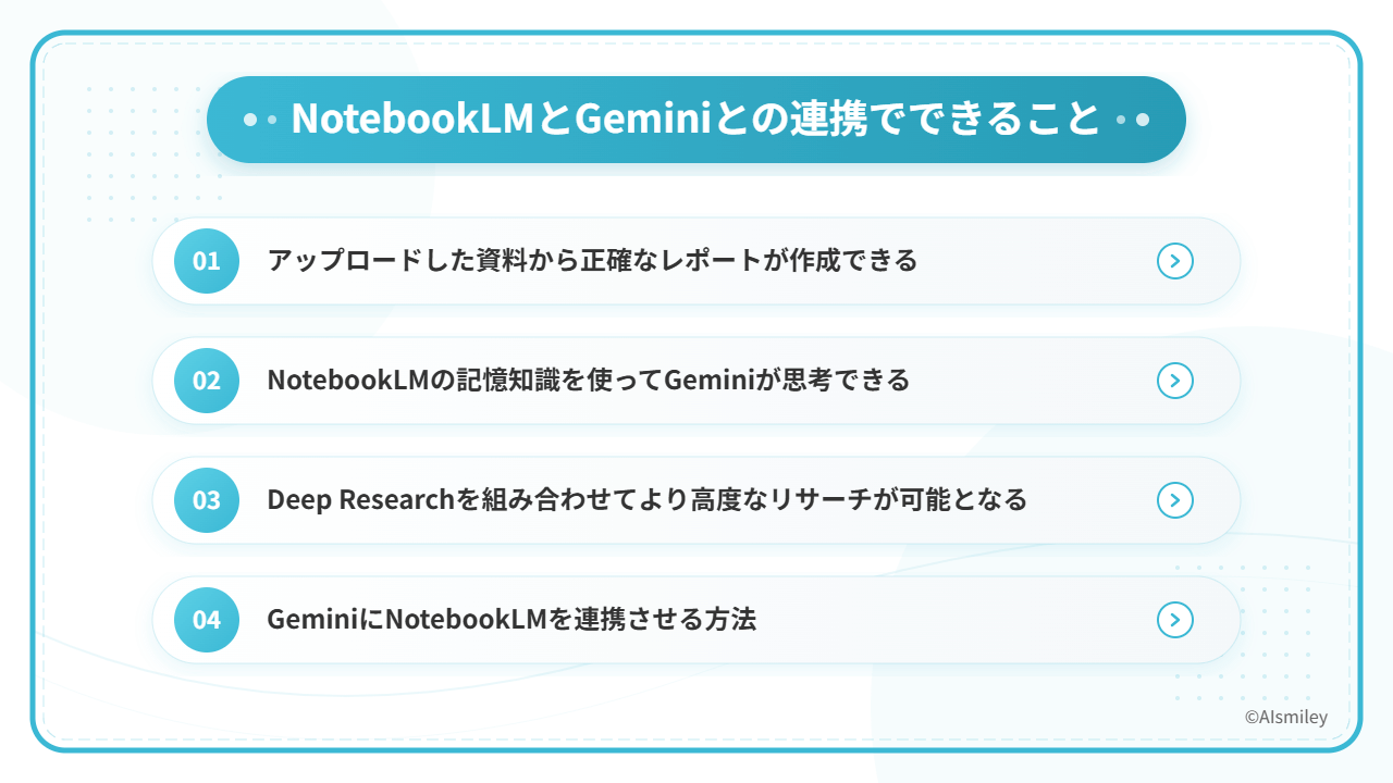 例えば、NotebookLMに保存した過去の市場調査データを基に、Geminiが最新のトレンドをDeep Researchで調査し、両者を統合した包括的な分析レポートを作成する、といった使い方が可能です。