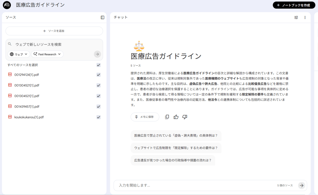 NotebookLMの特徴は、ノートブックに追加した資料(ソース)を根拠に回答し、引用で根拠を示せる点です。