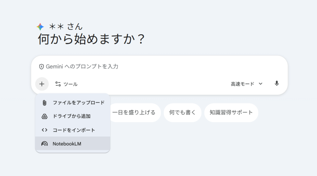 GeminiのWeb版では、NotebookLMのノートブック内容を直接読み込むことができます。NotebookLMで整理した知識が、そのままGeminiの思考材料となるのです。