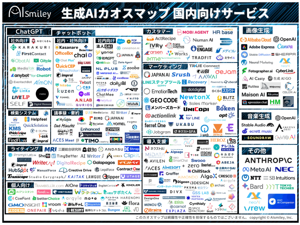 国内最大級のAIポータルメディア「AIsmiley」を運営する株式会社アイスマイリーは、ChatGPTをはじめとする生成AIサービス活用推進の一環として生成AIのサービスをまとめた「生成AIカオスマップ 国内向けサービス」を2023年11月13日に公開しました。掲載数は280製品以上です。