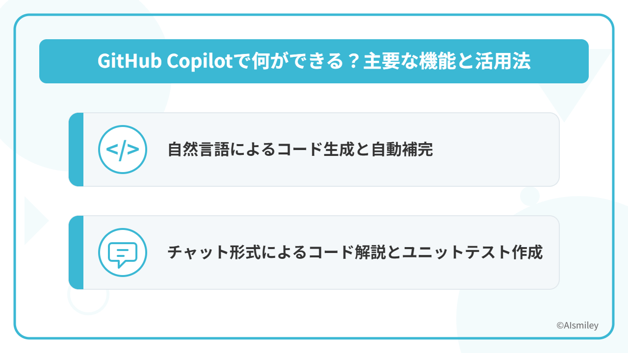 GitHub Copilotのコード生成機能は、入力したコメントや関数名をもとに、関数のロジックや定型コード(ボイラープレート)を丸ごと自動生成する機能です。AIが既存コードの文脈をリアルタイムに解析し、続きを予測・提案するため、Tabキーを押すだけでコードを採用できます。