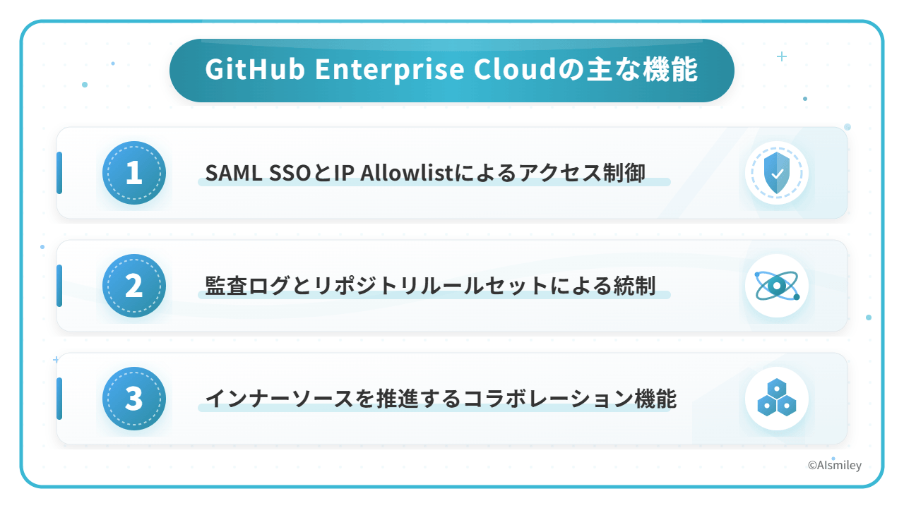 GitHub Enterprise Cloudでは、エンタープライズレベルのアクセス制御を実現するために、SAML SSOとIP Allowlistという2つの重要な機能が提供されています。