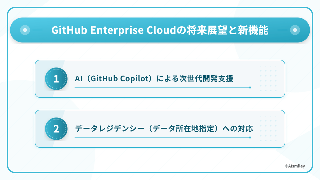 GitHub Enterprise Cloudは、エンタープライズ企業のニーズに応える形で継続的に進化を遂げています。特に注目すべき領域として、AI活用とデータ所在地管理の2つが挙げられます。