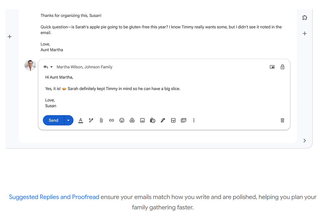 2つ目の「Help Me Write」は、メールの下書き作成や文章の推敲を支援します。新たに追加された「Suggested Replies」も、文脈に沿って適切な返信文をワンクリックで提案可能。返信候補は、ユーザーのトーンやスタイルを反映して生成され、送信前に自由に編集できます。