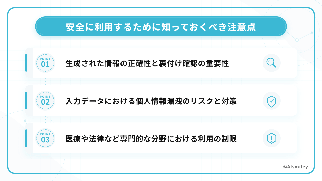 情報の正確性、個人情報の取り扱い、専門分野での利用制限といった主なリスクを理解し、ユーザー自身がリテラシーを持って最終的な判断を行うことが重要です。