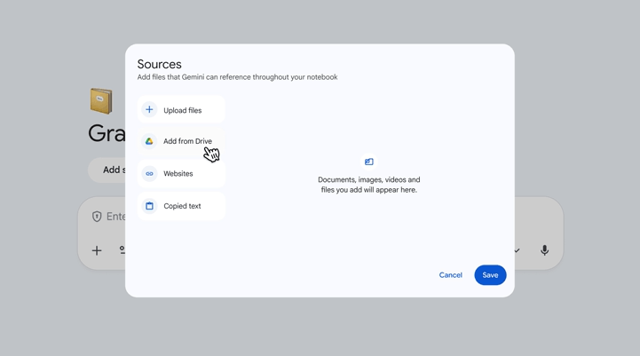 さらに、Geminiの回答に対する参考資料として、ドキュメントやPDFなどのファイル追加も可能です。これにより、ユーザーがノートブックに情報を整理することで、Geminiが各種ツールやWeb検索と組み合わせて、プロジェクトに基づく、より精度の高い回答を生成します。
