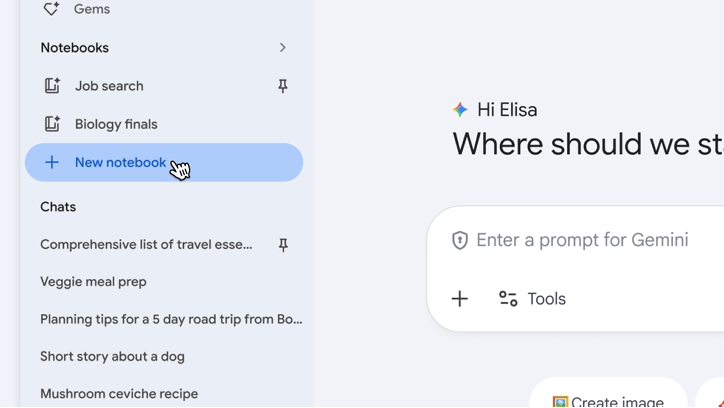 今回は、その連携強化として「Notebooks」を追加し、特定のプロジェクトに関するチャットやファイルを1か所に管理できるようになります。Geminiアプリのサイドパネルにある「New notebook」をクリックするだけでノートブックを作成でき、チャットをノートブックにまとめたり、Geminiにカスタム指示を与えることが可能です。