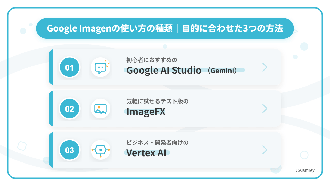 Google AI StudioやImageFXを通じた無料での個人利用から、Vertex AIを活用した企業向けの大規模運用まで、幅広いニーズに対応できる柔軟なプラットフォーム設計が特徴です。