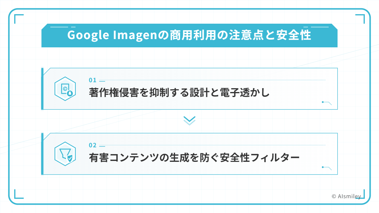 Imagenには、差別的・暴力的な表現を含む有害なコンテンツが出力されないよう、多層的な安全フィルターが実装されています。これはGoogleが定める信頼されたAI開発の原則に基づくものであり、プロンプトの段階と出力結果の双方でチェックが行われます。