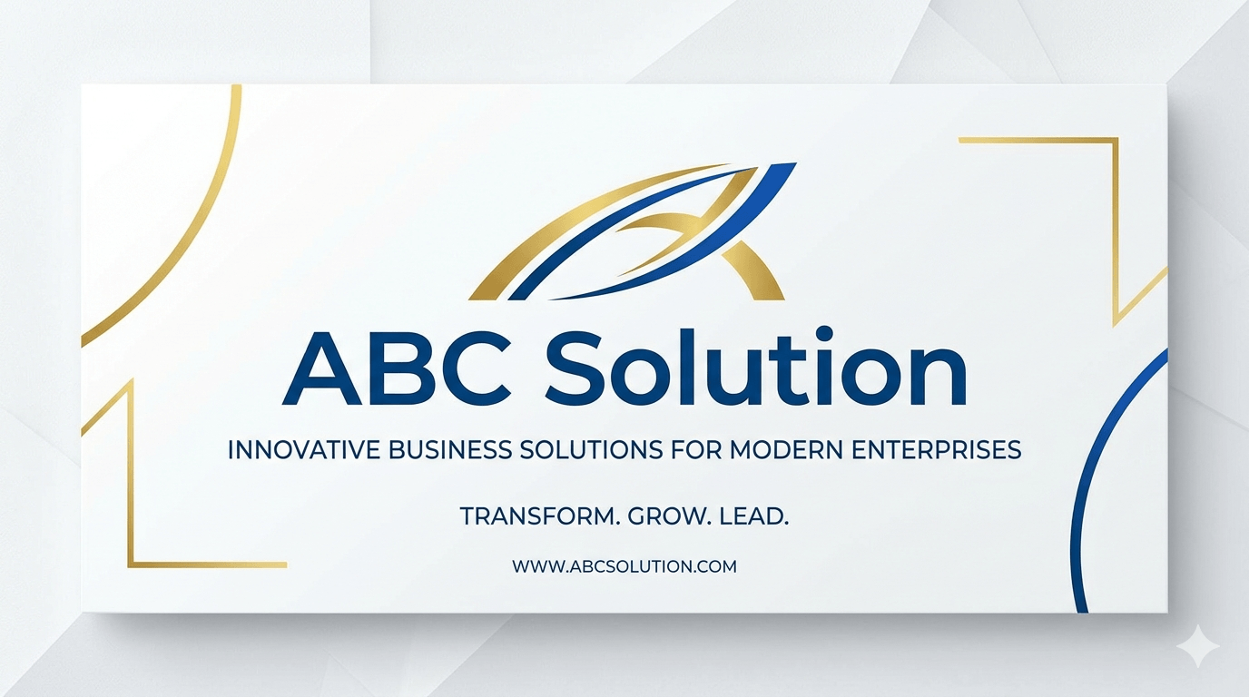 シンプルで洗練されたビジネス向けのバナー画像。白背景に青と金色のアクセントカラー。中央に「ABC Solution」というテキストをモダンなサンセリフ体で配置。横長16:9の構図。余計な装飾なし。