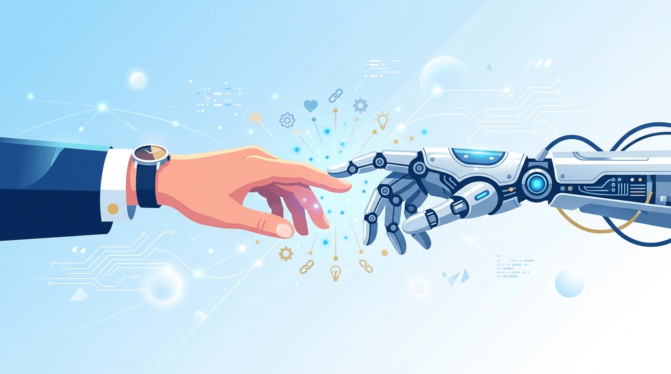「AIと人間の共存」をテーマにした未来的なイラスト。人間の手とロボットの手が触れ合っているシーン。淡いブルーとホワイトのグラデーション背景。フラットデザイン風。16:9の横長構図。