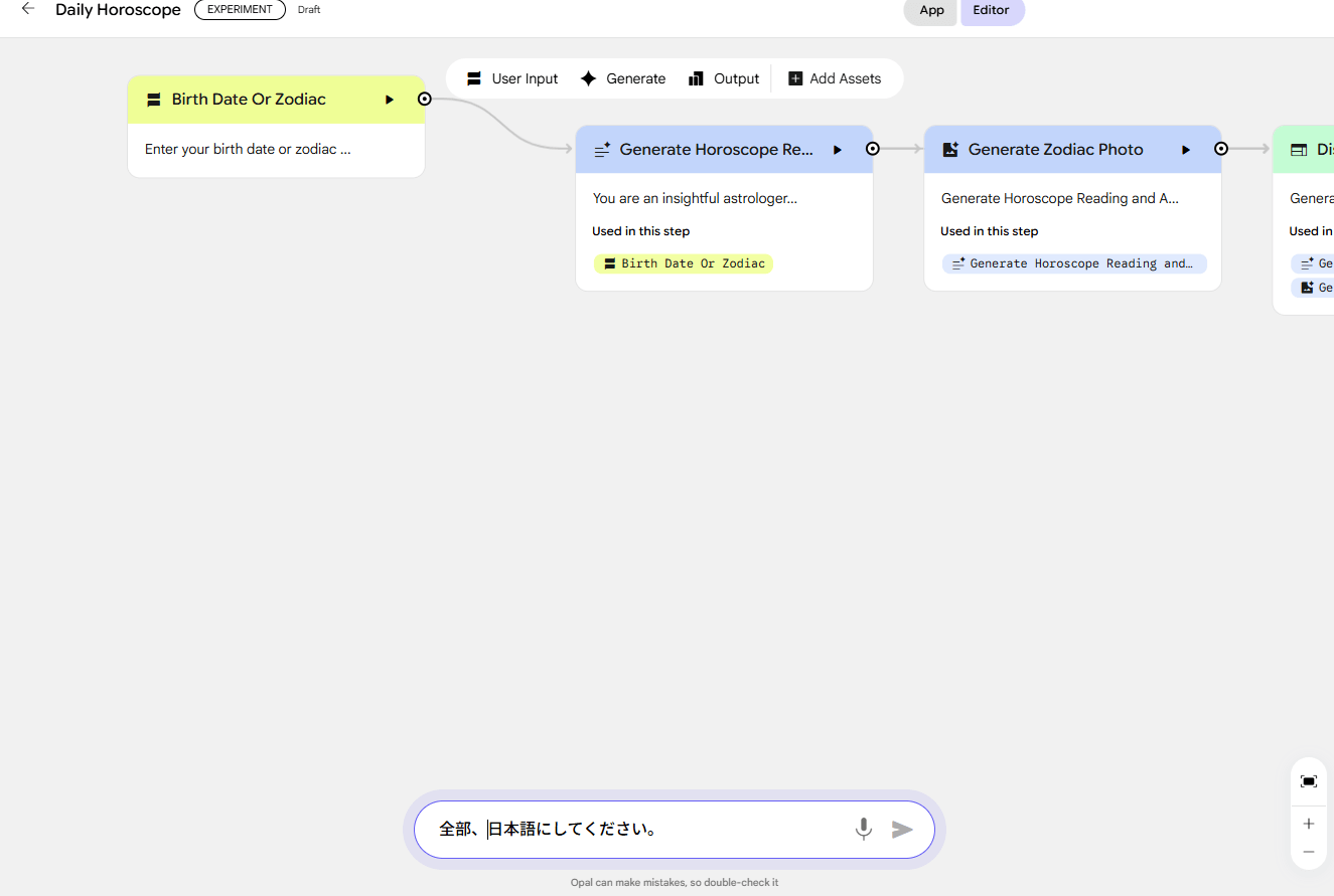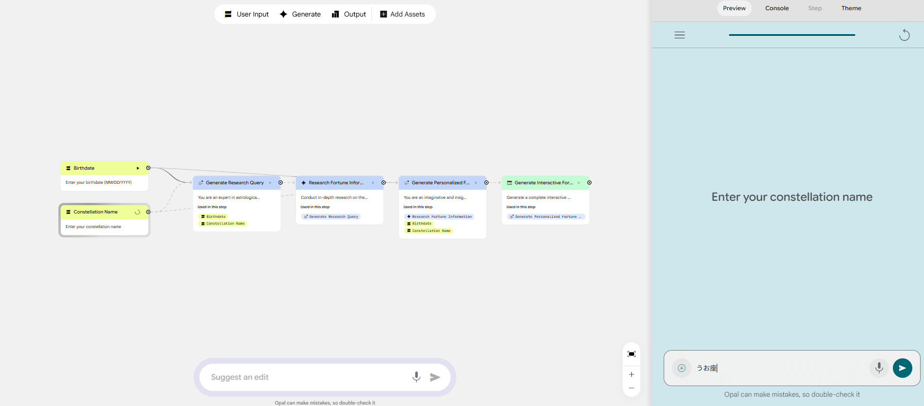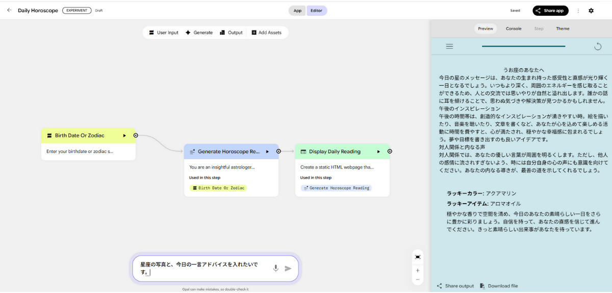 設計図を言葉(プロンプト)で伝えるだけで、図面(ワークフロー)と完成品(AIミニアプリ)を自動で出力してくれるのがGoogle Opalです。