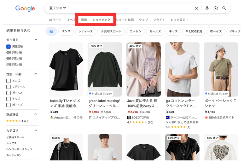 検索結果が表示されたら、「ショッピングタブ」か「画像検索」のタブを開いてください。
