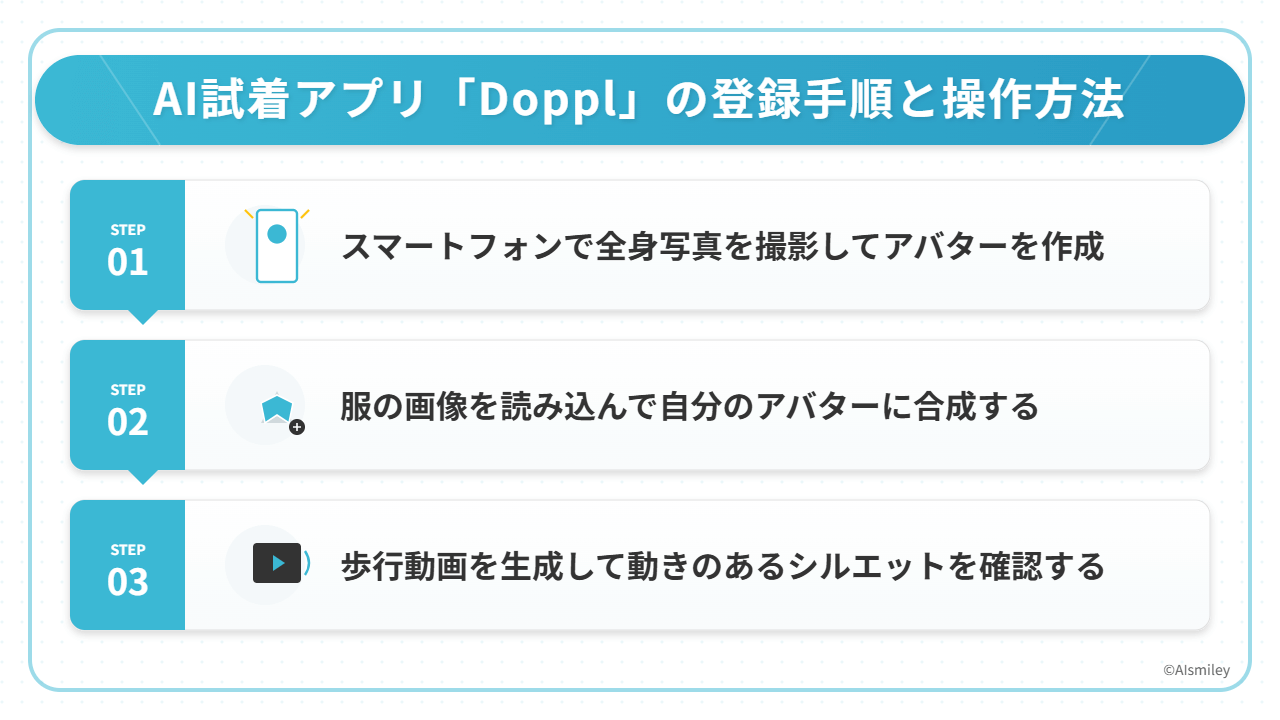 静止画だけでなく「動く姿」まで確認できるアプリ「Doppl」の使い方を解説します。アプリならではの高度な機能を活用するための流れは、次の3ステップです。