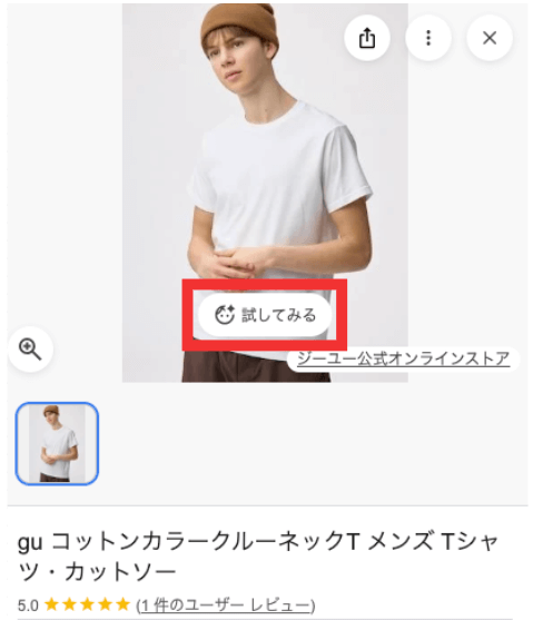 商品の画像をクリックすると、Try It Onに対応している商品には「Try On(試着する)」や「試してみる」というアイコンが表示されます。