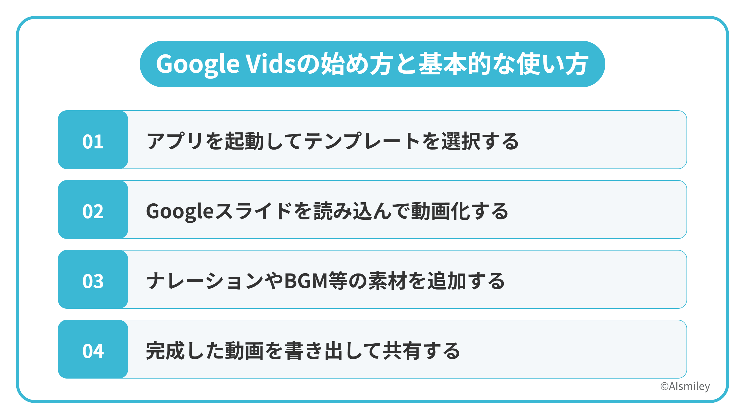ここからは、Google Vidsを使った動画作成の具体的な手順について解説します。