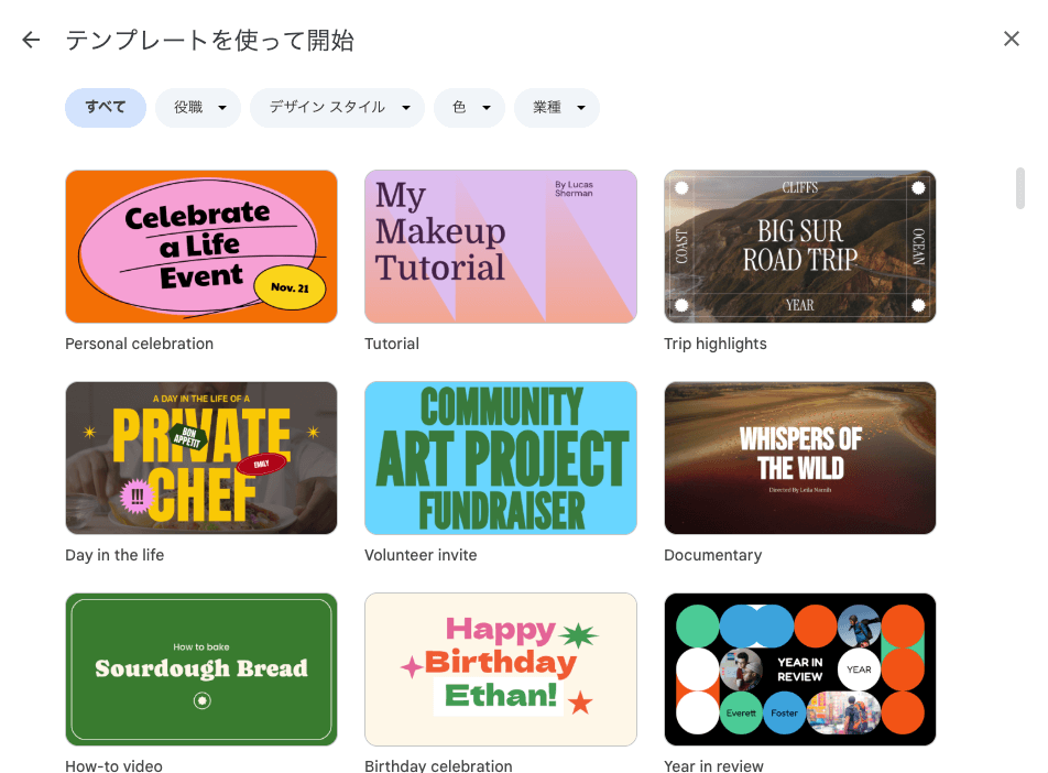 ここで「テンプレート」を選択すると、用途別のデザインが一覧で表示されます。製品紹介、社内研修、イベント報告など、目的に合ったテンプレートを選んで作成を開始できます。