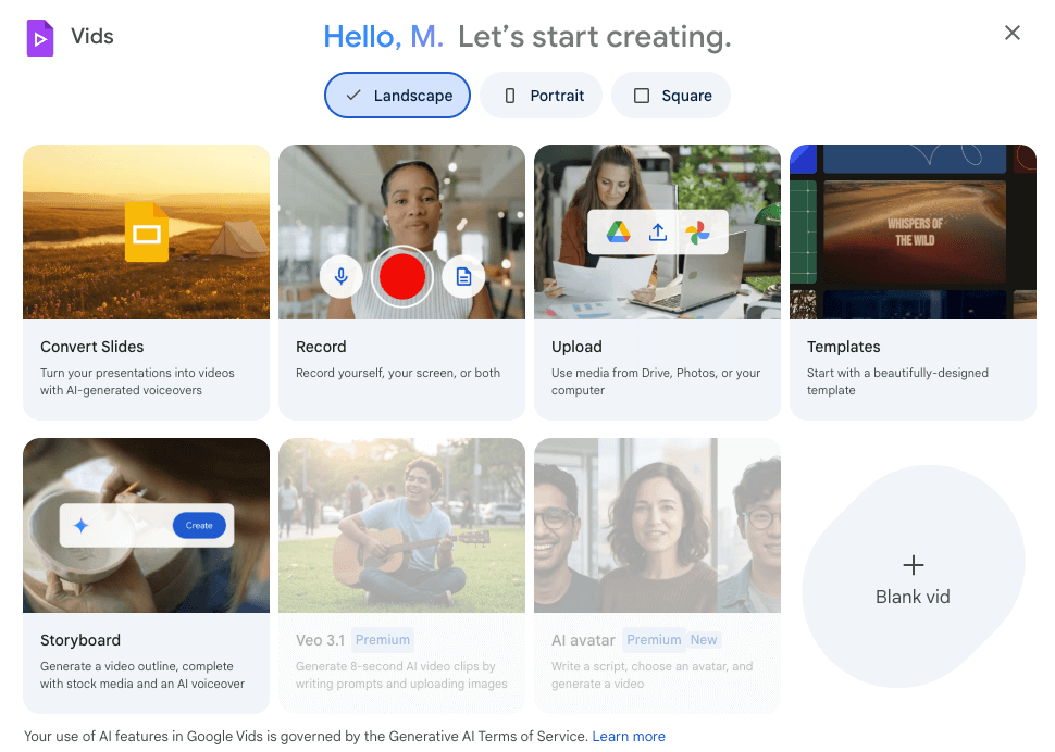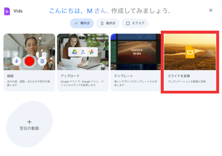 Google Vidsが起動すると、動画作成の開始方法を選ぶポップアップが表示されます。