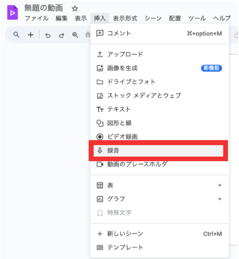 動画に音声を加えたい場合は、画面上部の「挿入」メニューから「録音」を選択します。