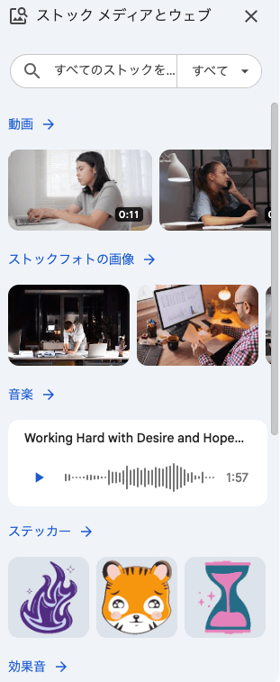 BGMを入れたい場合は、Google側の素材(「ストックメディアとウェブ」を選択)から音楽を選ぶ方法があります。タイムライン上にドラッグ&ドロップで配置できます。