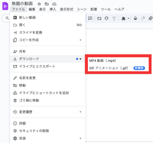 問題がなければ、画面上部のメニューから「ファイル」を選び、「ダウンロード」の「MP4動画」か「GIFアニメーション」をクリックしてください。