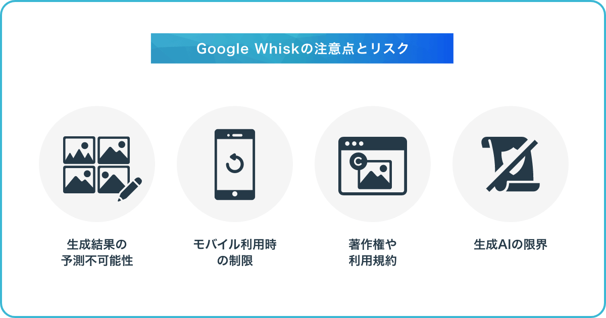 Whiskは高度な生成能力を持つ一方で、「写真のようなリアルさ」や「厳密な再現性」を求める用途には不向きです。