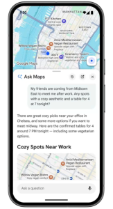 マップは3億以上の場所の情報を分析し、5億人以上の投稿者によるレビューも活用して旅程を作成し、過去の検索や保存履歴をもとに結果をパーソナライズします。例えば「ミッドタウン・イーストから来る友達と、今夜7時に居心地の良い雰囲気で4人入れるお店は?」と聞くと、ユーザーの食の好みを加味し、互いにアクセスしやすい中間地点のお店を見つけます。